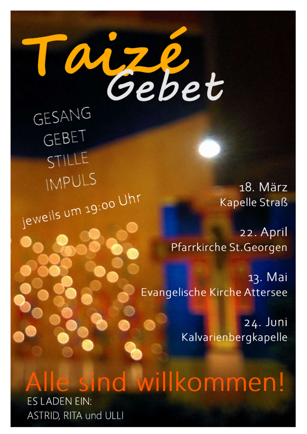 Ein ruhiges Abendgebet mit Liedern aus Taizé, Gebeten, Texten und Stille.